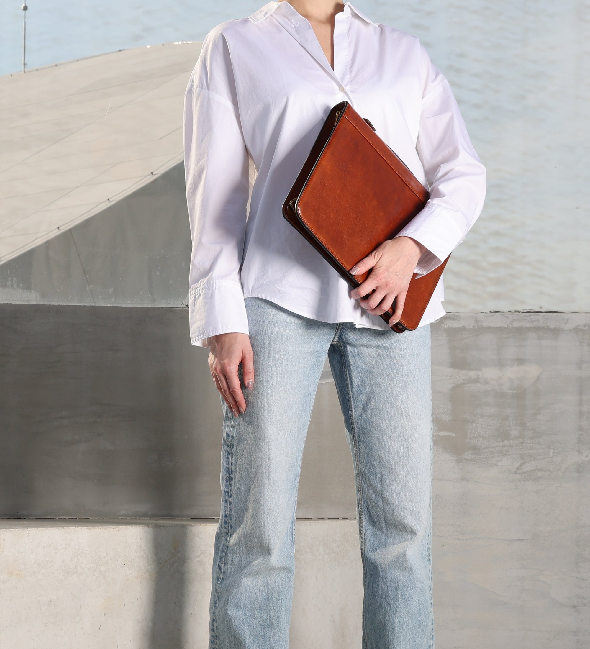 Introducing the "Joy in the Morning" Leather Portfolio, a beacon of professional ambition and confidence. Crafted with precision and finesse, this accessory embodies the essence of success with every stitch. Its sleek and minimalist design, accentuated by a refined handle, exudes a sense of purpose and determination, setting the stage for triumph. As you embrace its zip closure, anticipation swells, igniting the fire of ambition within. Open it to reveal a world of organization tailored to the needs of a driven individual. Each detail speaks to meticulous preparation and attention to detail, reflecting your unwavering commitment to excellence. Step boldly into the morning light with the "Joy in the Morning" Leather Portfolio, where professionalism meets aspiration in perfect harmony.