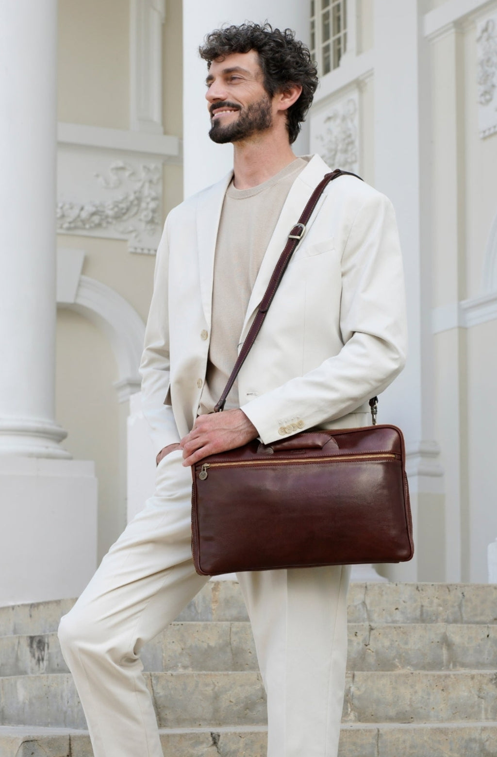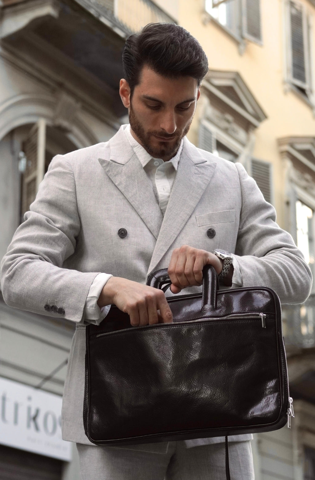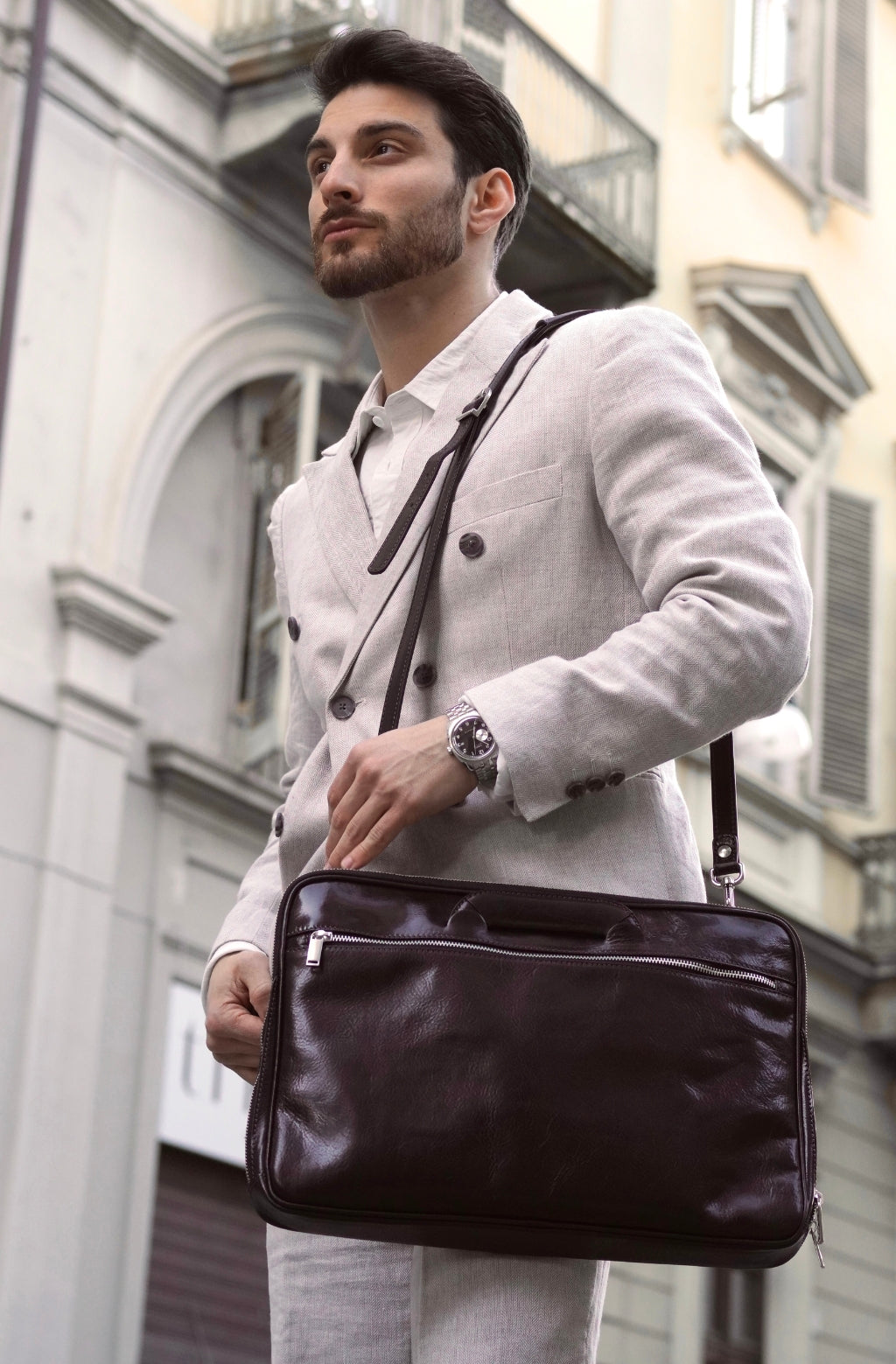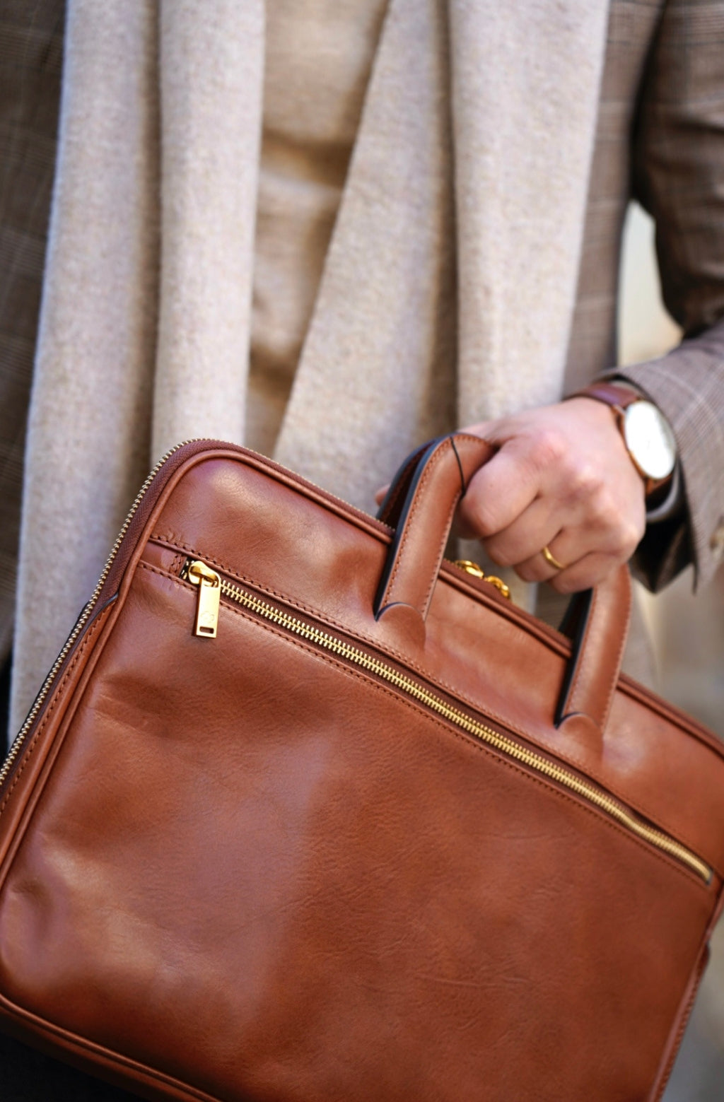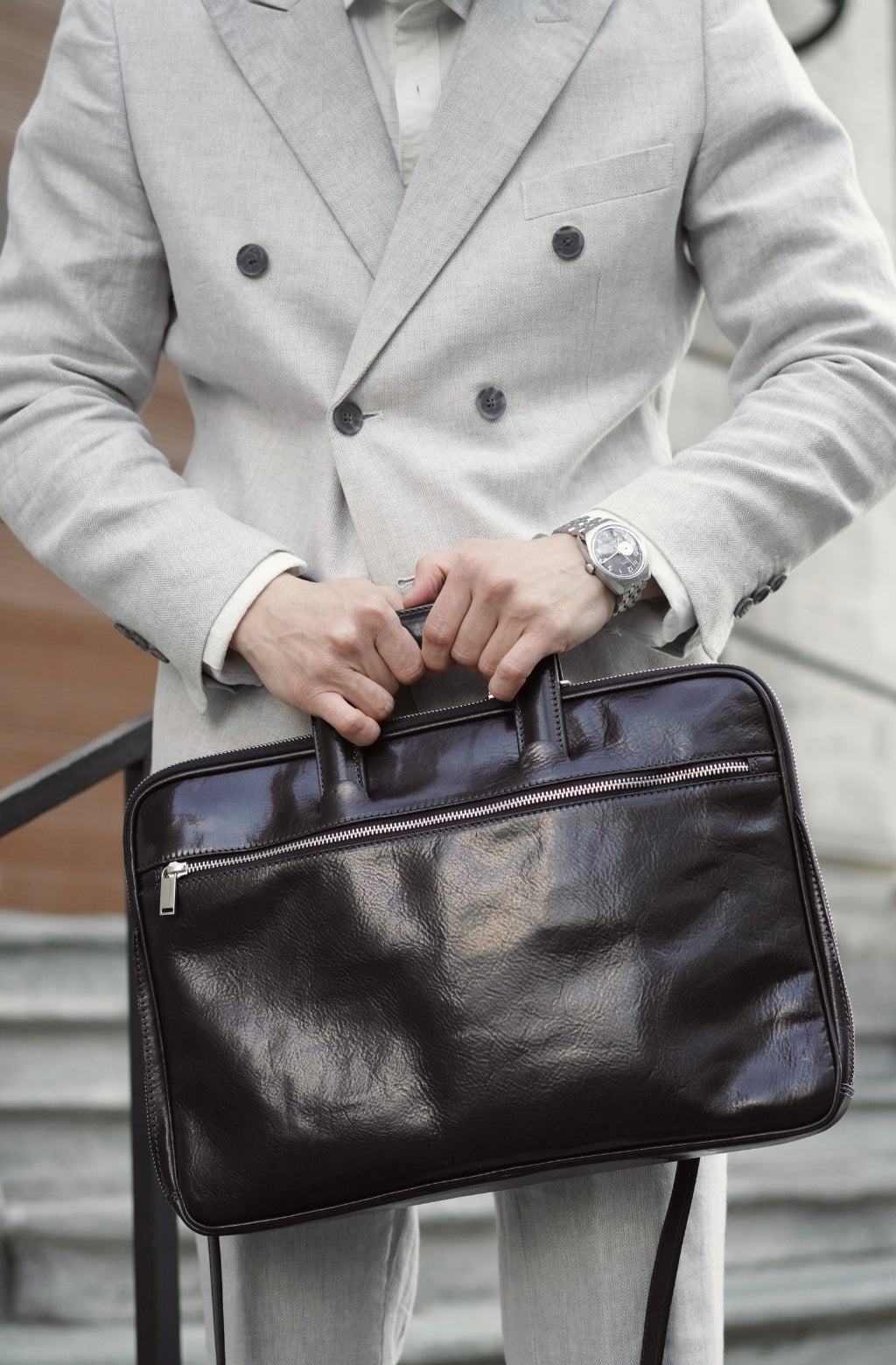A full-grain leather briefcase that expresses perfect harmony between hard and soft. Top quality hand-dyed leather gives a sentimental feel, but the lines convey a light touch of modern. Timeless and current. Manly and feminine. Urban practicality with charisma.