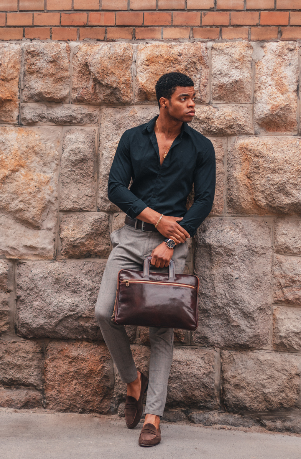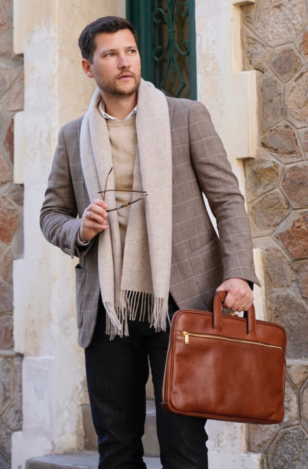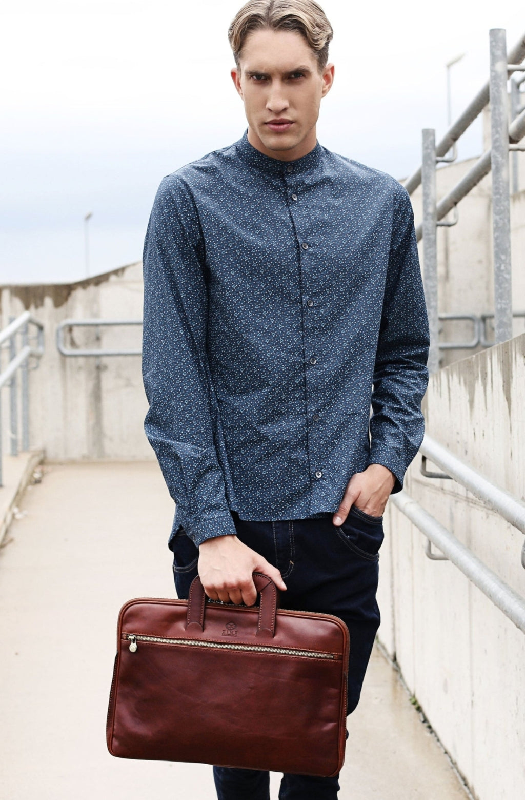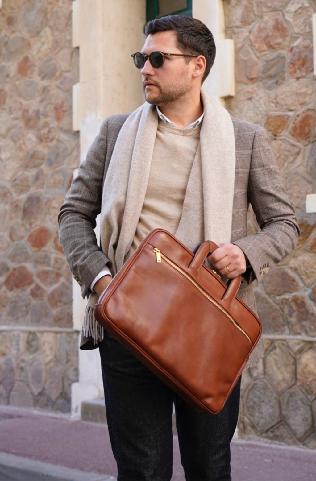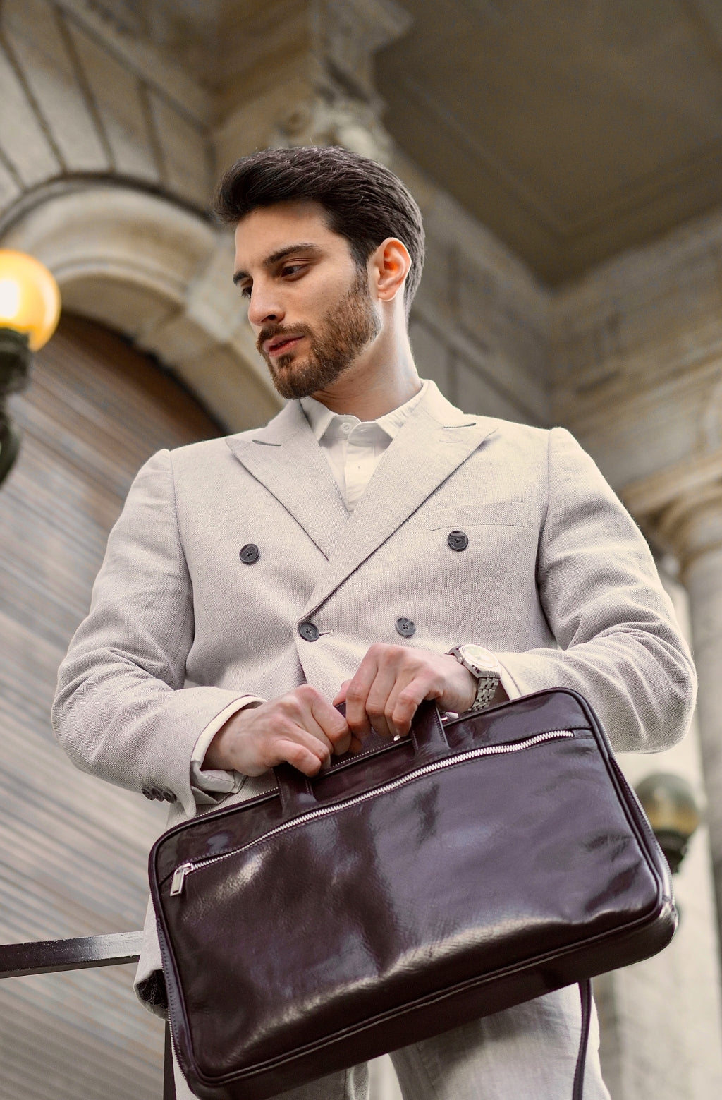 A full-grain leather briefcase that expresses perfect harmony between hard and soft. Top quality hand-dyed leather gives a sentimental feel, but the lines convey a light touch of modern. Timeless and current. Manly and feminine. Urban practicality with charisma.