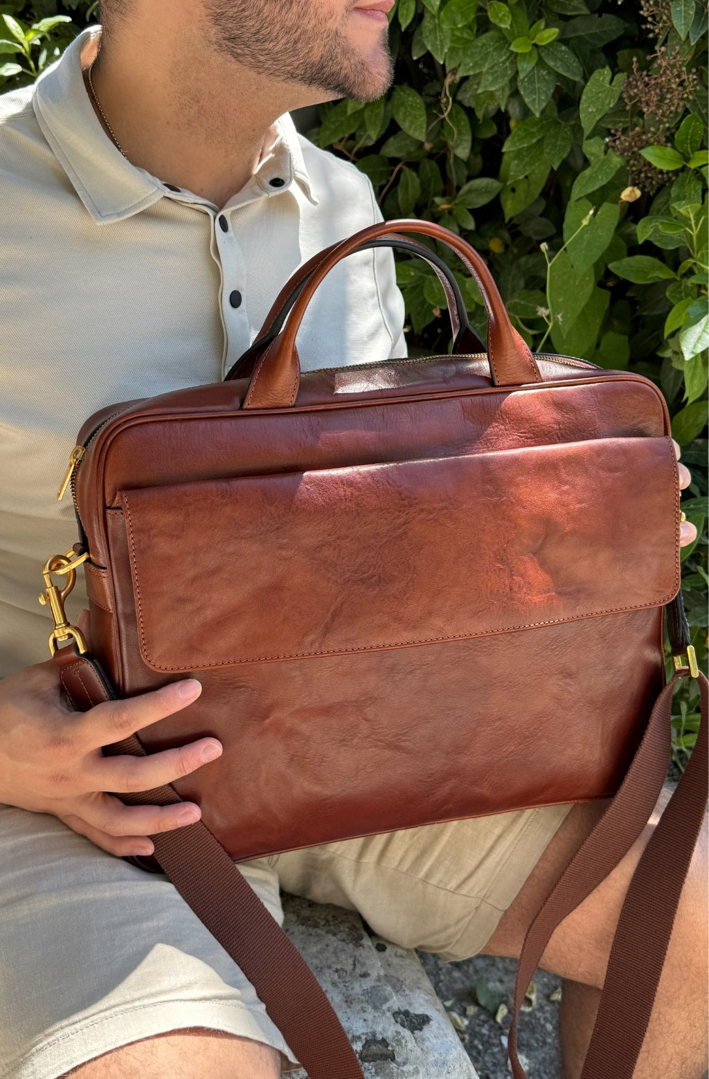 The Sheltering Sky - this leather briefcase is a great companion on the way to work or study. Its solid appearance is just perfect for both men and women's needs. Made from full-grain Italian leather, it comes with a trolley strap and a detachable shoulder strap, making it perfect for travel. The spacious compartments easily fit legal-sized paper, A4 documents, and folders, and it also has room for a 15-inch laptop. If that is not enough - we made an additional pocket with a flap on the front with an extra-strong magnetic closure ideal for keeping your essentials easily accessible.