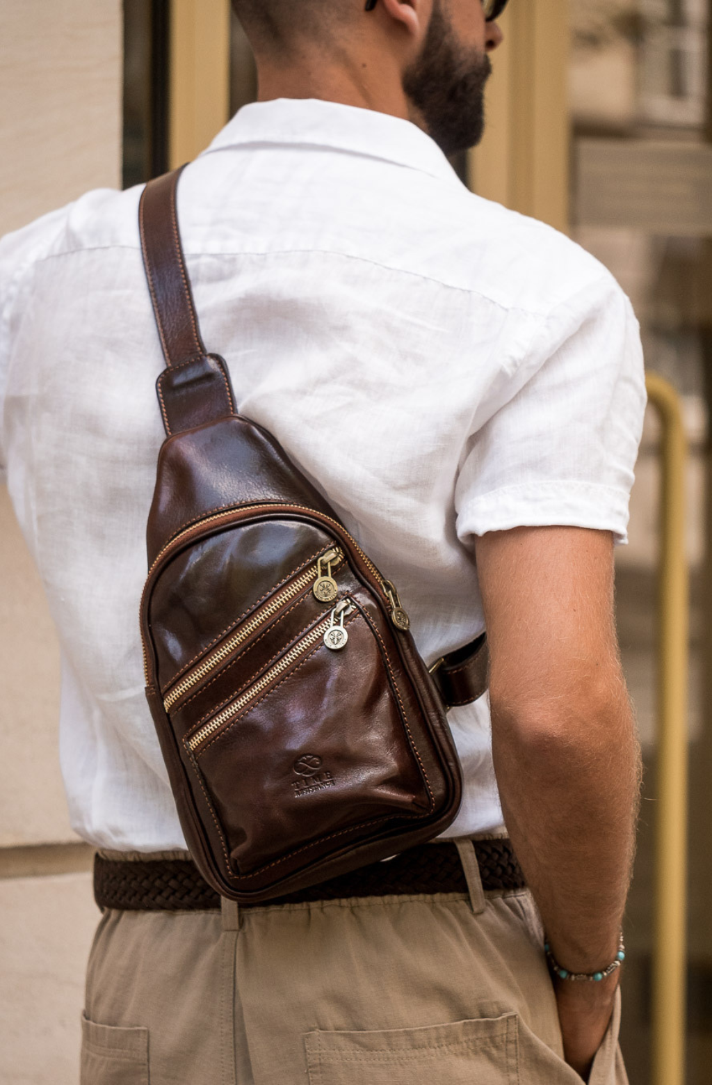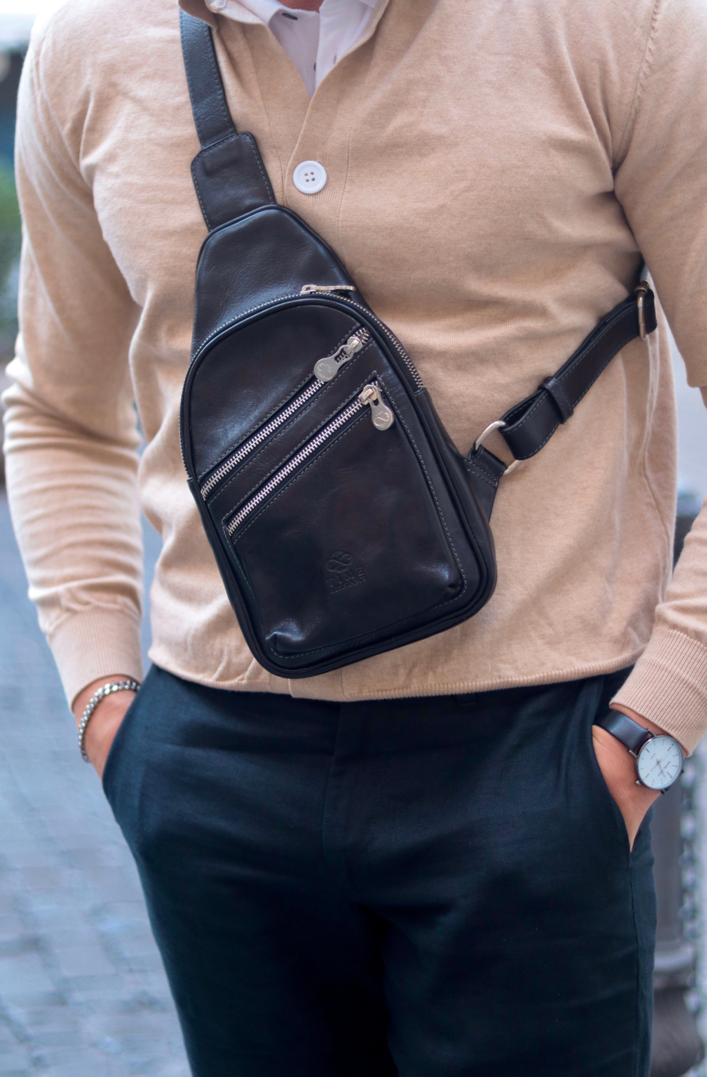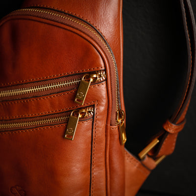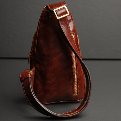 This Italian leather sling bag was designed to maximize the comfort of traveling. Our full-grain leather chest bag Catch-22 can be carried on the chest and on the back. Close to the body premium quality fanny pack does not restrain movements nor spirit of traveling.