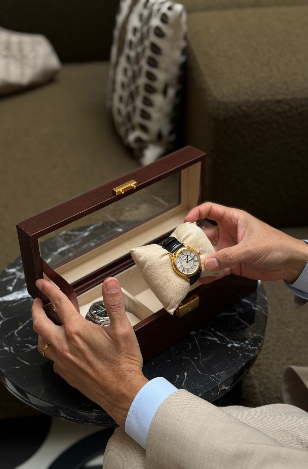 Hand dyeing is an artisan process where each hide is colored by hand, layer by layer, bringing out its rich tone and natural beauty.