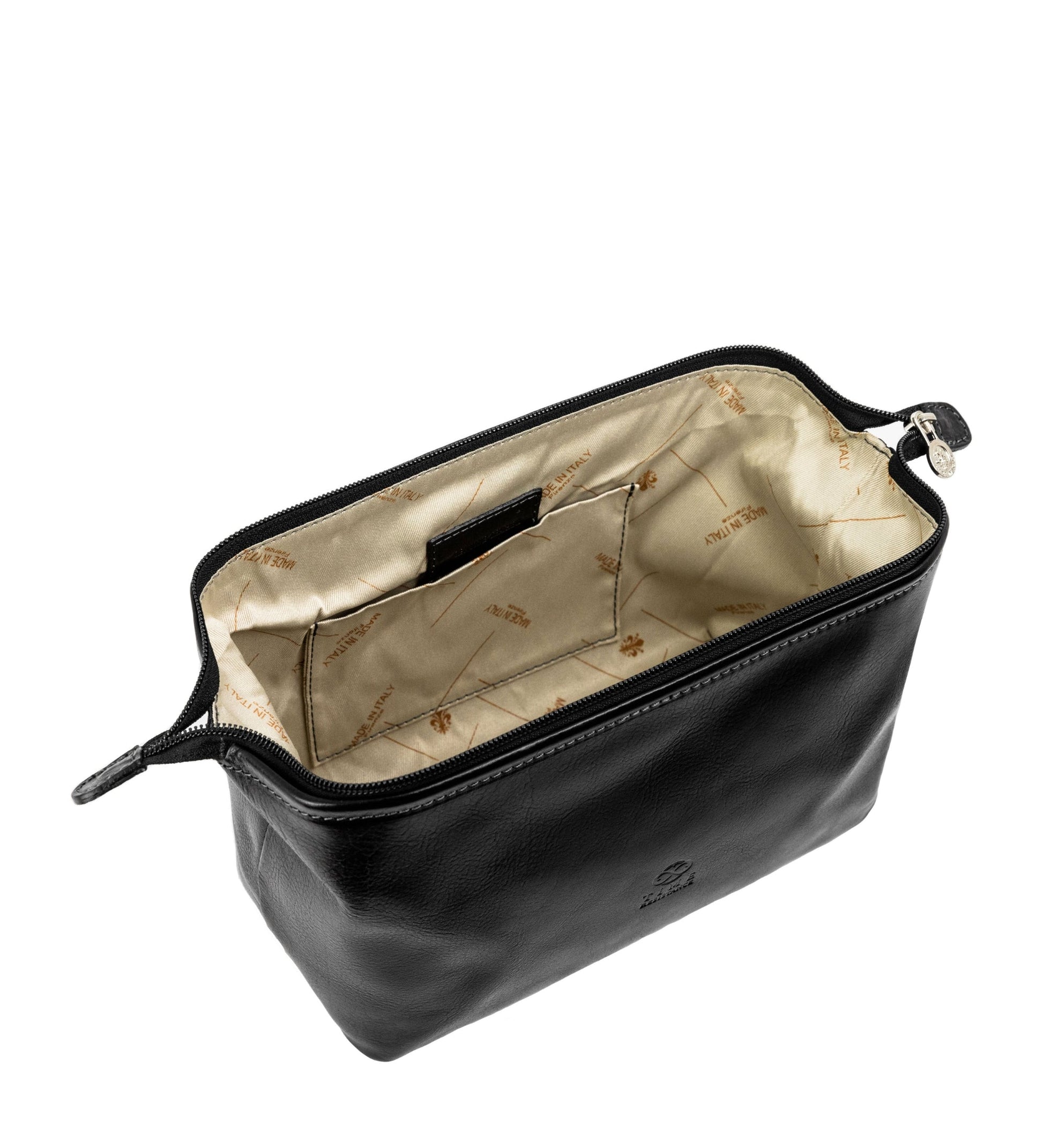 A full-grain leather wash bag is roomy enough to fit all your daily necessities with an inside pocket and a frame that allows for full open...
