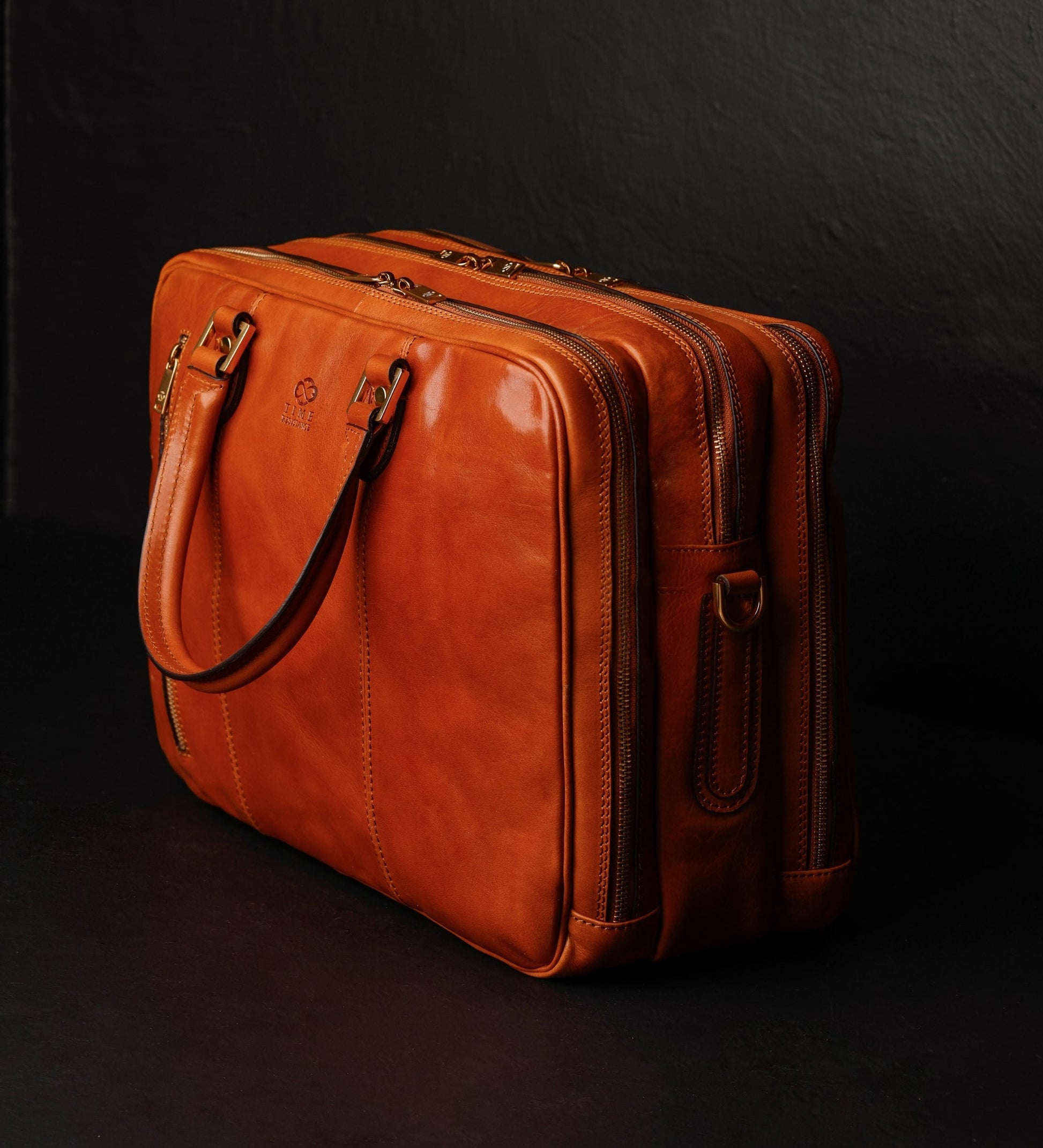 A spacious briefcase for a heavy traveler. This full-grain Italian leather work bag has three compartments and lots of pockets for all your...