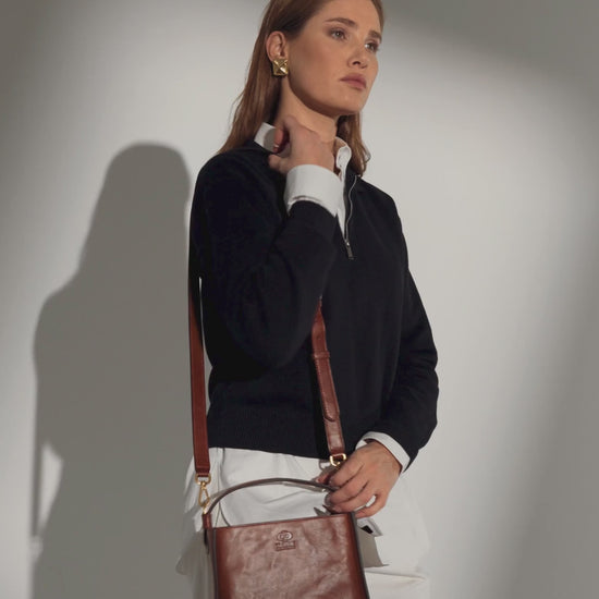 A beautifully made leather handbag. However, it falls a little short at being described as a tote bag. It also has quite a big opening around the close of the zipper. This doesn’t allow the bag to be fully closed. The opening of the bag is a small as well.