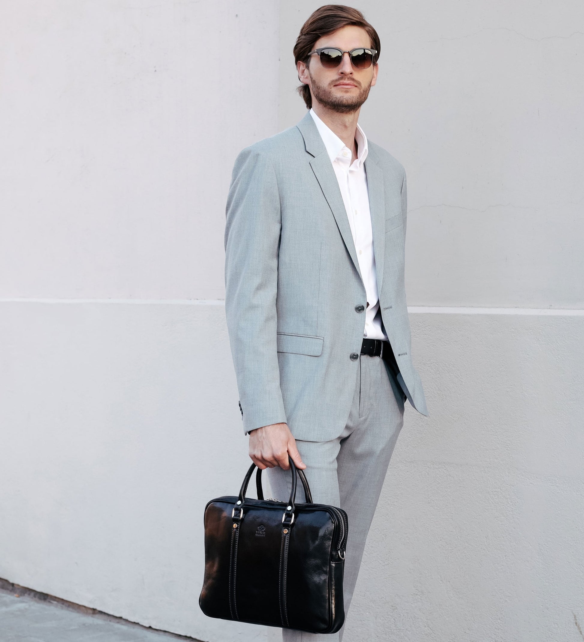 This briefcase is perfect for just the essentials (and a bit more). First of all, it's super stylish in it's design (rather handsome looking), it's full-grain leather, vegetable tanned, made in Italy, and has strong hardware and YKK zippers. It's small, but a very sturdy and solid bag.