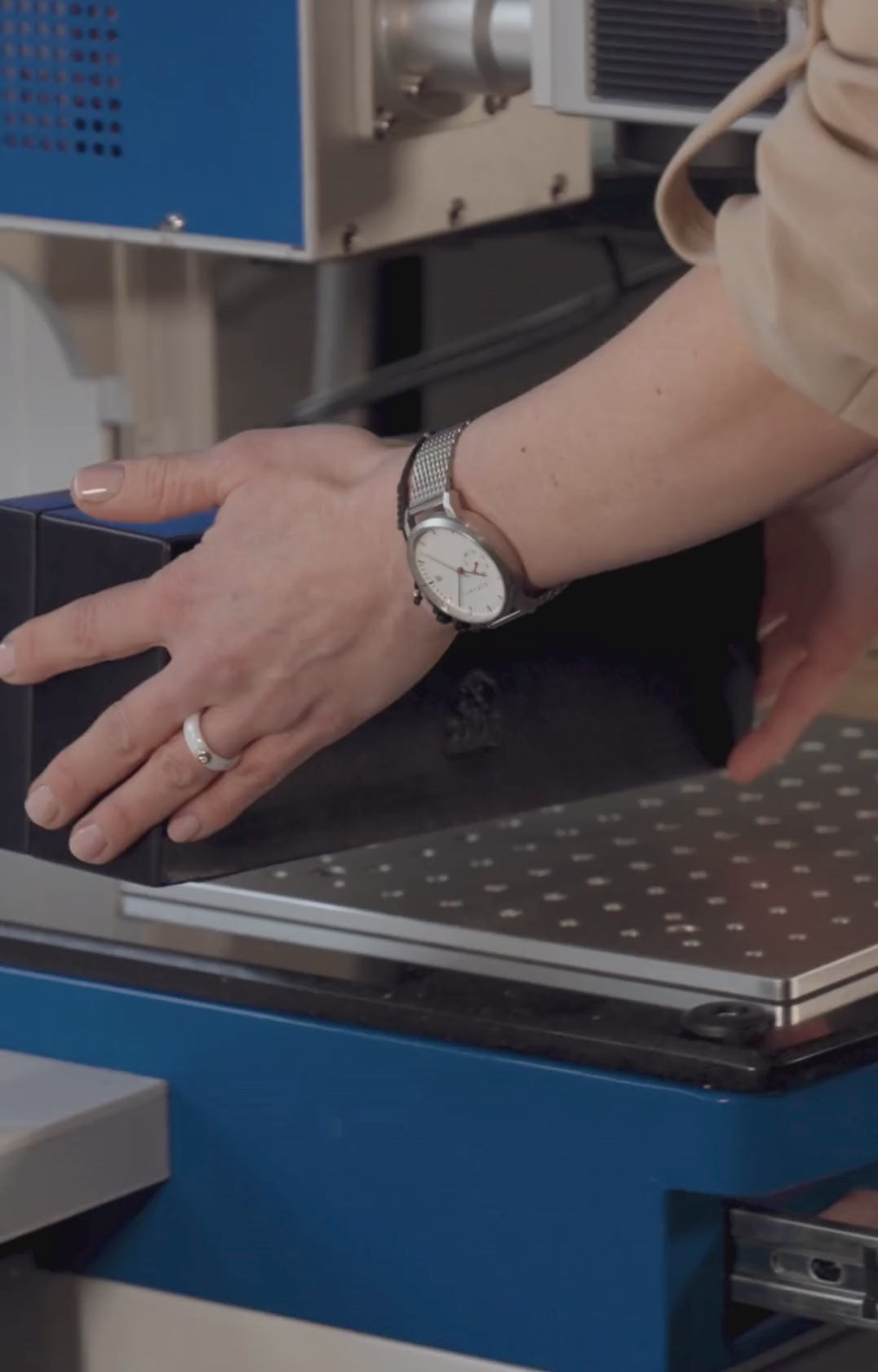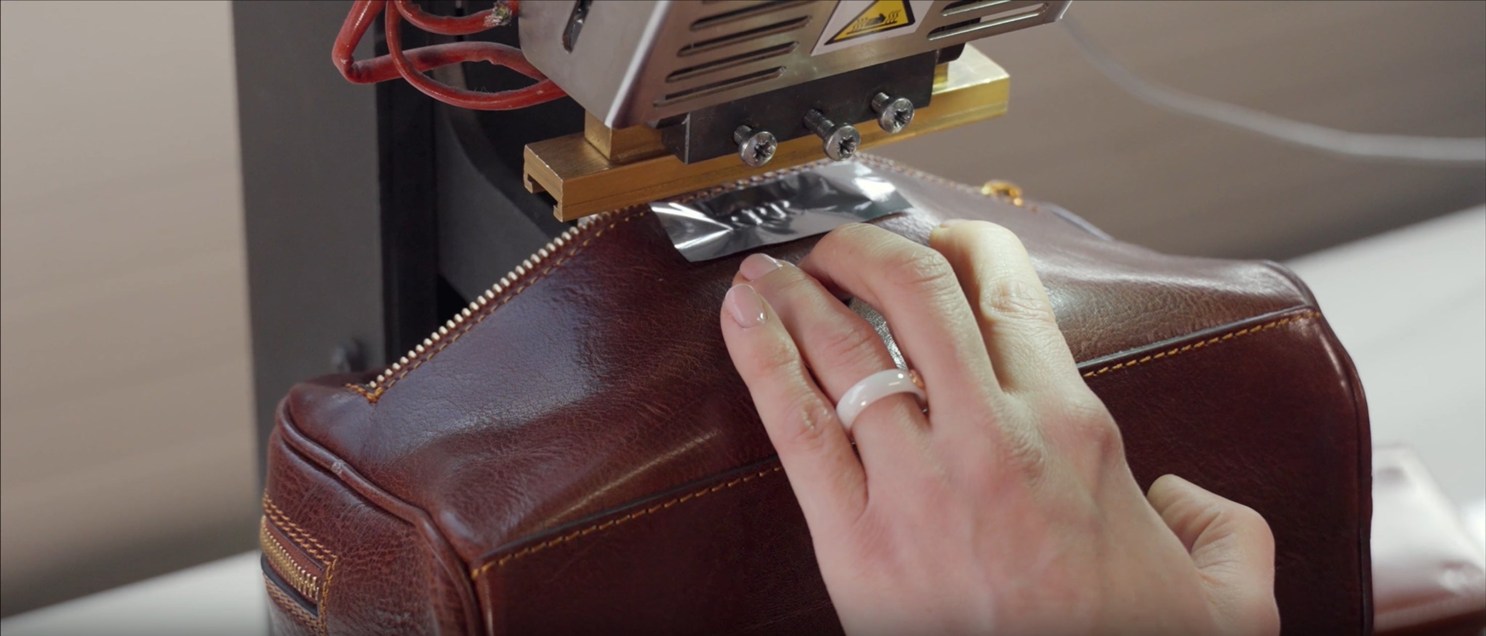 Laser engraving reacts with the leather surface, producing a unique shade each time that depends on the leather’s color; the engraving color is determined by the leather and cannot be freely selected.